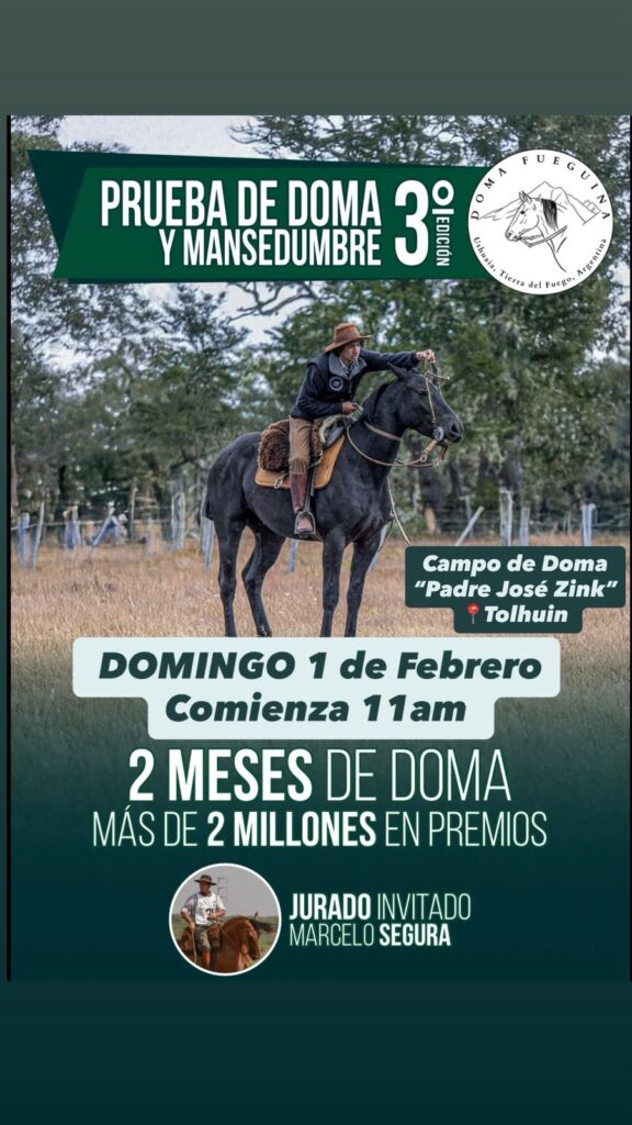 El próximo domingo 1 de febrero se realizará la actividad en la ciudad de Tolhuin. Será desde las 11 de la mañana en el Campo de Doma «Padre José Zink» a cargo de Doma Fueguina.