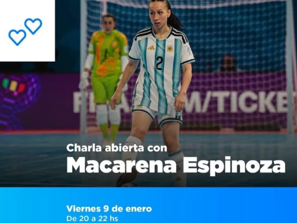 El próximo viernes de 20 a 22 horas la jugadora de futsal Macarena Espinoza se presentará en el Polideportivo Augusto Lasserre. Será en la Cancha 4 «Hugo Italo Favale» donde realizará una charla abierta y un pequeño entrenamiento con el semillero local.