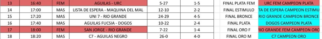C7 y Río Grande RHC se quedaron con la Copa de Oro en masculino y femenino. URC fue Plata entre las chicas, «Lista de Espera» logró imponerse en el segmento Estímulo mientras que los «Dogos» de Caleta Olivia se llevaron para el norte de Santa Cruz la Copa de Plata.